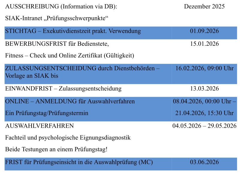 Für die Zulassung ist eine dreijährige Exekutivdienstzeit bzw. bei Insp-FGP eine fünfjährige Gesamtdienstzeit einschließlich einer mindestens 45 Monate dauernden praktischen Verwendung im Exekutivdienst (siehe Stichtage oben) gefordert. Die Durchführung beider Teile des Auswahlverfahrens findet an einem Prüfungstag im angeführten Zeitraum (für OÖ im BZS Wels) statt. Die Probanden absolvieren an einem via SIAK-Campus ONLINE selbst ausgewählten Prüfungstag den Fachteil und die Psychologische Eignungsdiagnostik. Im Sinne der Gleichbehandlung beginnen alle Probanden zuerst mit dem Fachteil und nach einer kurzen Pause wird mit der Psychologischen Eignungsdiagnostik fortgesetzt. Es gibt weder eine Zwischenreihung noch eine Zwischenwertung (Bekanntgabe der Punktezahl). Beim MC-Fachteil gilt eine Mindestpunkteanzahl (110 Punkte), was bei Nichterreichen dieser Punktezahl zum sofortigen Ausscheiden führt.