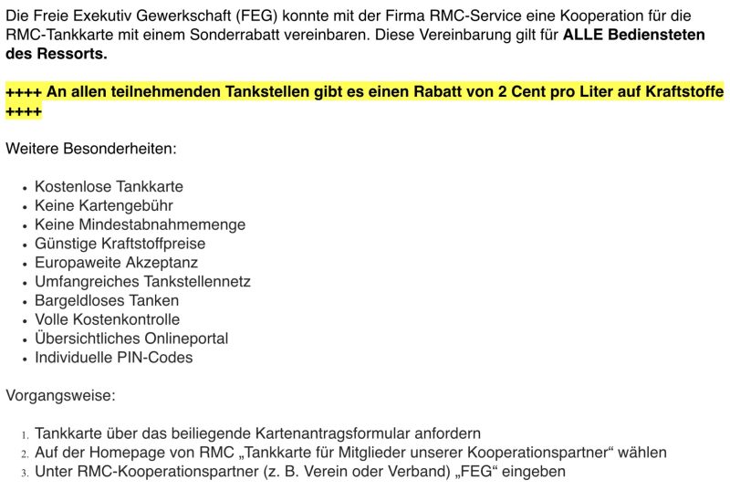 Über unsere Plattform für Mitarbeiterangebote sind ab sofort Produkte und Dienstleistungen zu dauerhaft attraktiven Konditionen verfügbar. Die Nutzung der Plattform ist ein kostenloses Service, das nach einmaliger Registrierung mittels dienstlicher E-Mail-Adresse zur Verfügung steht. Der Zugangscode kann unter feg@feg.at angefordert werden.